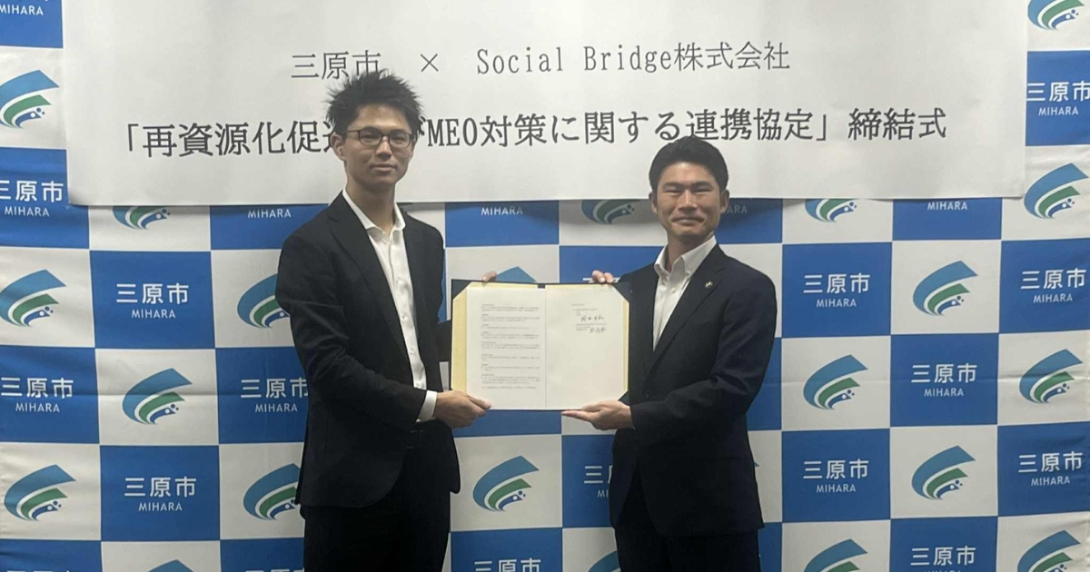 令和7年7月22日(火)、三原市役所で「再資源化促進及びMEO対策に関する連携協定」の締結式が開催さ… -