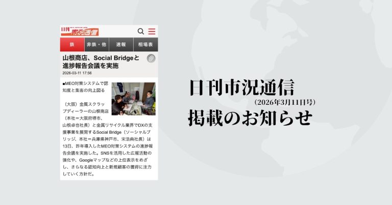 MEO対策の取り組みを「日刊市況通信」(2025年10月20日号)に掲載いただきました!【メディア掲載】 投稿日 2025年10月24日 更新日 2026年3月3日 著者 @social-bridge-admin カテゴリー お知らせ カテゴリー メディア掲載 このたび、「日刊市況通信」(2025年10月20日号)に、弊社のMEO対策システムに関する取り組みが掲載されました。 弊社が提供するMEO対策システムは、導入企業様のGoogle検索表示数向上や集客効果の改善に寄与し、掲載事例では導入後わずか3か月で検索順位1位を達成した企業様もいらっしゃいます。 今後もDXを通じて、リサイクル業界の発展に貢献してまいります。