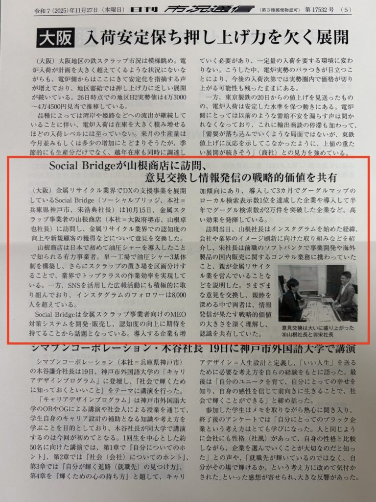 このたび、日刊市況通信(2025年11月27日号)にて、当社 Social Bridge(ソーシャルブリッジ)の取り組みをご紹介いただきました。