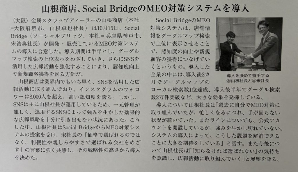 このたび、日刊市況通信(2025年12月1日号)にて、山根商店様とSocial Bridgeの MEO対策システム導入 に関する取り組みをご紹介いただきました。